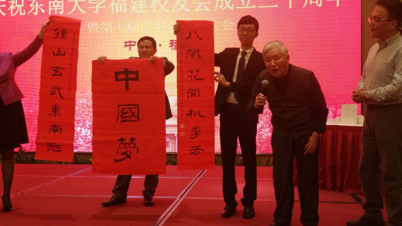 在本届东大福建校友会成立三十周年庆祝大会期间,我院56级校友林亮森先生为福建校友会赠送了内容为“钟山玄武东南冠,八闽花开桃李芳”对联一副。