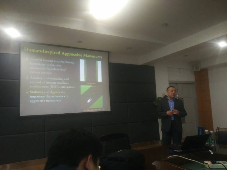 讲座中JingangYi教授围绕“轮胎/路面交互动力学系统的估计、传感与控制”这个话题,首先对轮胎/路面交互动力学系统的研究作了较全面的理论梳理,对“轮胎/路面交互机理”、 “行驶过程中轮胎内部压力场分布与传感”、 “轮胎力学的非线性建模”、 “轮胎/路面交互动力学的估计技术”等多个车辆系统动力学领域的关键问题作了深入的讲解。随后对“车辆动力学的非线性控制”、“车辆稳定性与灵活性理论发展”等国际前沿研究进展进行了展望。最后,Jingang Yi教授与学生进行了热情的互动,详细解答了学生的学术疑惑。