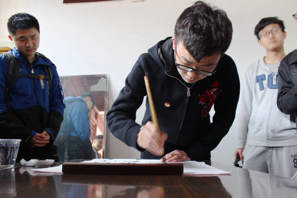支部成员王颢森同学有感而发,现场研墨挥毫,书写书法作品“丝穿经纬通欧亚,路拓东西话阜康”。作品书写规范,运笔娴熟,获得静海寺纪念馆收藏荣誉证书,被纪念馆永久收藏