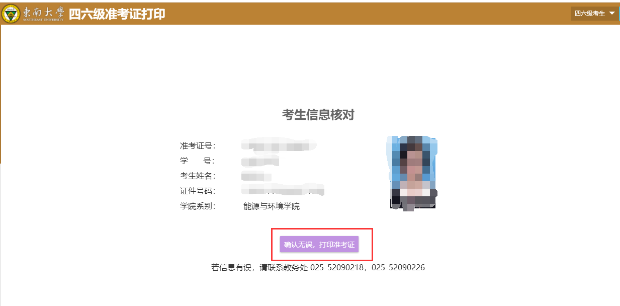 3、点击东南大学-四六级准考证打印APP,第一次进入时,在弹出页面点击‘进入服务’。进入信息核对页面(如图三)。