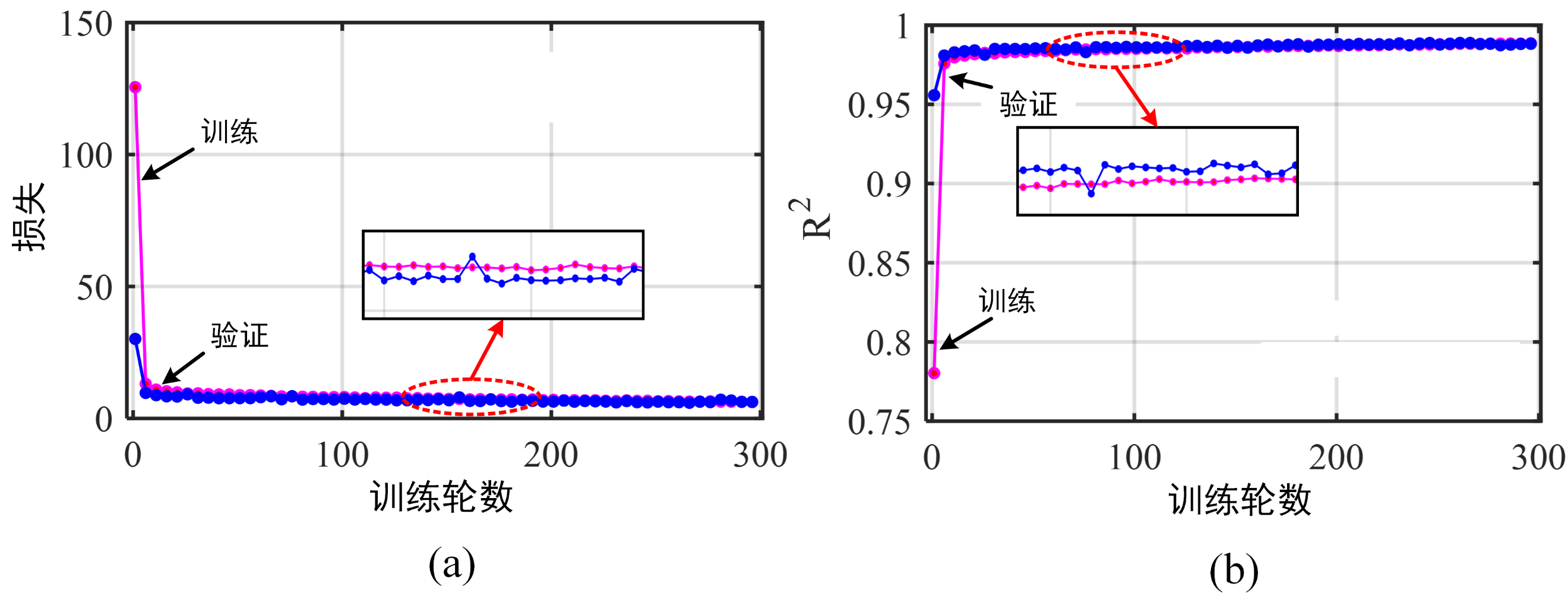 利用半解析有限元法(SAFE)构建频散曲线数据集训练ENet模型。训练数据集的规模和质量对于深度学习模型的实际应用是一个棘手的问题。但凭借半解析有限元法高效的计算效率,ENet的训练集极易获得。通过将频散曲线与弹性模量非线性关联,避免了模型学习过程中实验环境对数据集的干扰。ENet模型的训练和测试在Inter® Core™ i5-1135G7Inter® Iris® Xe Graphics服务器平台进行。在训练ENet模型前,可以对数据集进行预处理,对每批次中的输入数据进行归一化。以学习率0.0001训练ENet 300轮(Epoch),训练过程耗费大约半小时。训练和验证的结果:损失和R2 coefficient曲线如图3所示。
