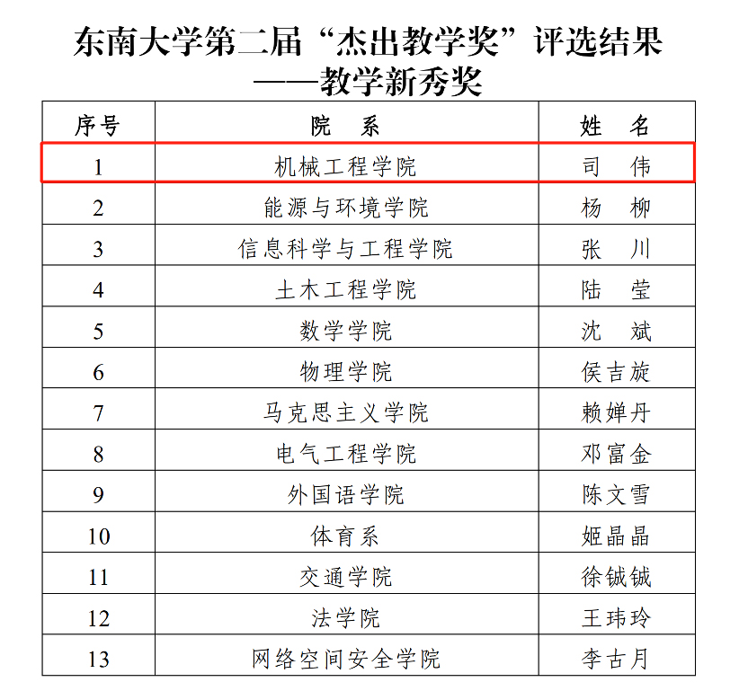 近日,东南大学公布了第二届“杰出教学奖”评选结果,我院司伟副教授荣获“教学新秀奖”。