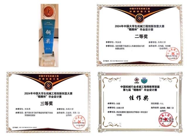在决赛环节中,经过现场评委专家审阅、现场答辩和实物演示等多环节紧张激烈地角逐,我校由庄伟超、刘帅鹏(企业导师)指导,刘泳志同学完成的毕设项目《动态场景下低速无人车路径规划与控制算法研究》获全国二等奖,全国个人铜奖;由王金湘、苏亮(企业导师)指导,刘东昂同学完成的毕设项目《基于强化学习的不确定性环境下自动驾驶路径规划》获全国三等奖、全国优胜奖;由温海营、魏超(企业导师)指导,刘君同学完成的毕业设计项目《四足机器狗行星机构关节驱动一体化设计与仿真》获全国三等奖,全国佳作奖。